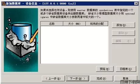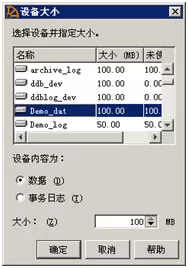 4、在上面的"设备信息"窗口中为数据库Demo分配数据设备和日志设备。点 添加 按钮,在弹出的小窗口"设备大小"中