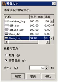 7、选择设备Demo_log,指定设备内容为:事务日志,并分配大小为设备Demo_log的最大值:50M。点 确定 按钮返回到"设备信息"窗口中。