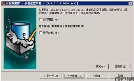 9、使用覆盖 和 用于装载 这两个选项都不要选择。使用覆盖选项只有在数据段和日志段都分配到同一个数据库设备的情况下才必须选中。用于装载选项能够提高数据库的创建速度,但是创建数据库完成后必须首先恢复数据库(load database)才能使用数据库。