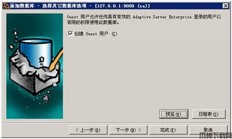 10、选中创建Guest 用户选项,表示为数据库Demo添加用户:guest。这样其他非授权用户可以以guest的名义访问用户数据库Demo,并执行guest拥有权限的操作。点 下一步,继续