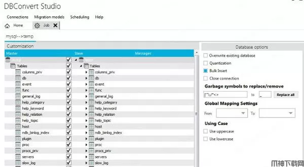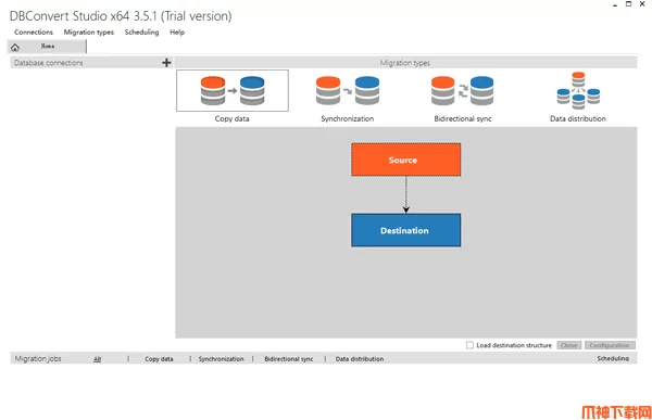 DBConvert Studio是一款功能强大的跨数据库迁移和同步软件,软件可以在各种格式之间无缝地转换数据库结构和数据,不同的同步选项使数据源节点和目标数据库节点的数据保持全新,源和目标数据库连接可以配置为任何本地或远程MS Windows,Linux,MacOS或BSD数据库服务器。DBConvert Studio可自由够建立新的目标数据库、表、索引或将数据传输到现有的数据库,它可以在迁移你数据库的的同时,保持你的数据完整性,制作多种的数据库记录,快速完成数据库迁移;DBConvert Studio还提供批量脚本更新的功能,该软件可以实现计划、增量、两表记录保持一致等方式的同步操作,同时提供给开发商二次开发的接口,开发商可以很方便地配置需要进行同步的数据。