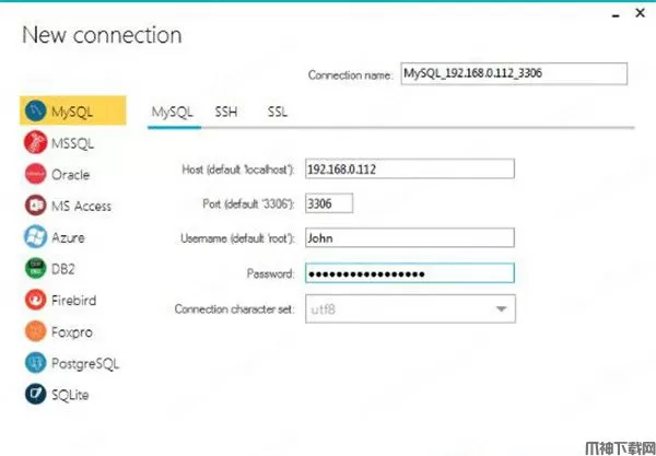 在新建连接窗口中,从支持的数据库列表中选择所需的数据库类型,通常需要IP地址,端口,用户名和密码作为设置数据库连接的必要信息。下面的图片显示了源MySQL节点和MS SQL目标节点作为此示例