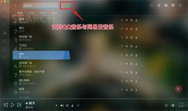 由于软件拥有网易和QQ双平台引擎,所以可以一秒轻松切换账户、切换歌曲搜索结果和歌曲榜单推荐。