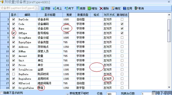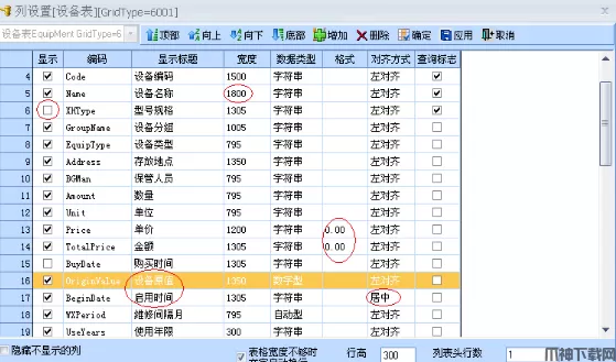宽度:宽度代表了该字段在主界面显示的宽度,例如设备名称相对于设备编码长度较长,为了完整的显示设备名称,可以在这里设置字段宽度;