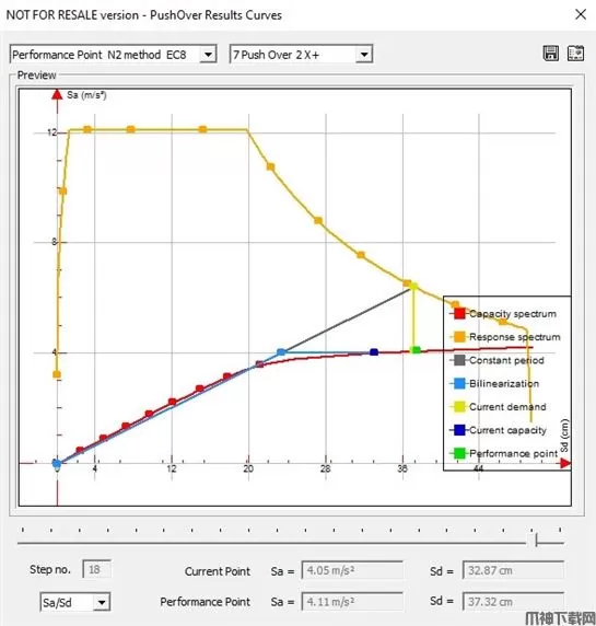 自 2021 版以来,Advance Design 中提供的 Pushover 分析已扩展为性能点计算。性能点是结构承载力(以推覆曲线表示)与地震需求(以地震动加速度响应谱(需求曲线)表示)之间的平衡点。根据 EC8 或 ATC40 将地震谱转换为 ADRS(加速度位移响应谱)谱,并将其与容量曲线叠加以定义性能点。这两条曲线以 ADRS 形式表示并叠加以图形方式查看性能点。Pushover 结果曲线中提供了相应的图表。