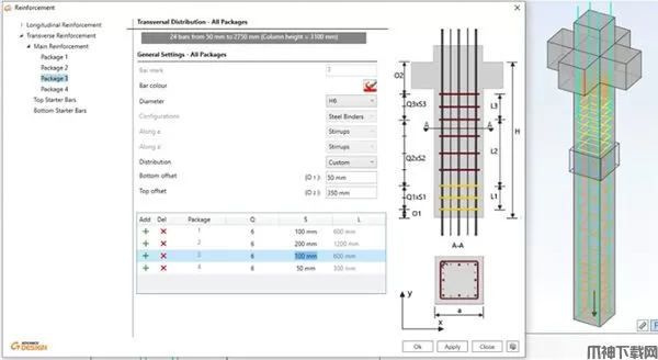 该程序的最新版本在钢筋混凝土模块中 3D 钢筋的生成和编辑方面引入了许多改进。其中之一是关于柱中横向钢筋编辑的完全修改部分。得益于表格中的编辑、钢筋包的链接以及分布类型的轻松选择,横向钢筋的编辑或生成既快速又直观。
