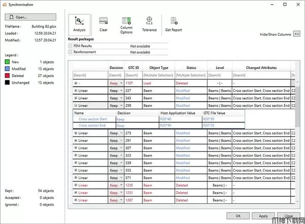 使用Graitec GTCX格式同步数据期间使用的对话窗口已被修改。这使得同步模型的过程变得更加容易和快捷。通过新选项,用户可以更好地控制同步数据。在众多改进和新功能中,我们可以提到轻松过滤数据的能力、轻松的表配置、更清晰的状态和变化呈现以及基于树的数据结构。此外,还可以选择导入到 Autodesk Revit 的结果范围。