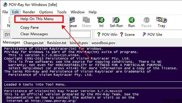 1、点击启动pov ray软件后,主界面显示的是光线跟踪的界面,下方显示使用的说明,点击帮助功能,可以让您在设计的时候查看作者说明