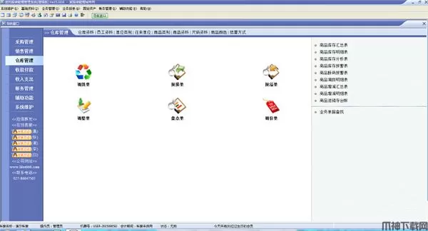 ◆基本功能 智能订货、进货入库、进货退回、销售出库、销售退货、报损、报溢、调入、调出、收款、付款、预收、预付、收入、支出、成本、利润及财务会计核算等。