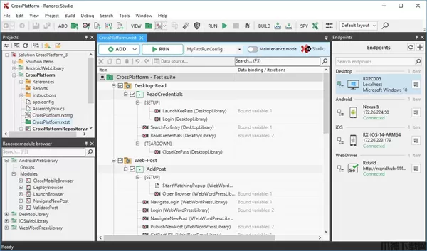Ranorex Studio将测试套件与它们将要运行的环境分开。创建测试后,它可以在不同的外部Web或移动端点上运行,也可以在本地Selenium Grid或云提供商上运行。端点面板是设置和管理端点以及配置其环境的中央指挥中心。