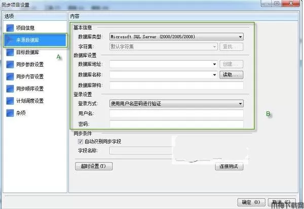四、首先切换到 "来源数据库" 选项卡。填写同步的来源数据库信息(存放需要同步数据的数据库叫做来源数据库);