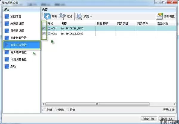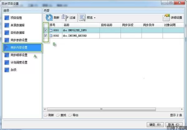 六、切换到 "同步内容设置" 选项卡,选择需要同步的数据库表;