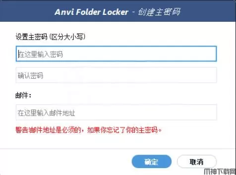 1、运行软件,首次打开需要设置主密码,您可以输入密码以及邮件地址