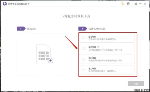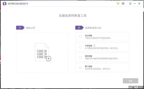 疯师傅压缩包解密助手软件,该软件界面简洁美观,所有功能都一目了然的呈现在用户眼前。用户可根据自身需求合理的选择破译压缩密码的方式,如组合破解、字典破解、掩码破解、暴力破解等,每种破解方式都有其出色的优势所在,可针对于不同时间、需求来进行选择。并且软件使用十分简单,只需将遗忘密码的压缩包进行添加,选择破译方式便可高效的完成,在此过程中十分高效,能即时为用户还原所需资料。不仅如此,其中最为一提的是,软件体积小巧、绿色无毒,可很好地保障破译过程中不泄露用户任何隐私,并且支持破译rar、zip、zip等多种不同的压缩包格式,对此你心动了吗?为了防止小伙伴不知道如何使用疯师傅压缩包解密助手,下文小编还准备了详细的图文使用教程,希望可以帮助到有所需要的朋友更好的进行使用。