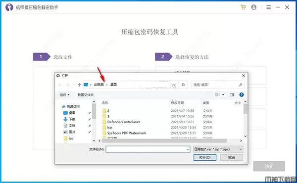 2、在选取文件窗口一栏下选择要解密的rar、zip、zipx文件。