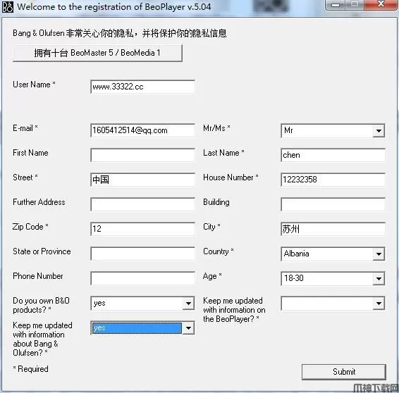 4、全部填写完成之后,点击“submit”注册成功,之后打开“BeoPlayer.exe”即可