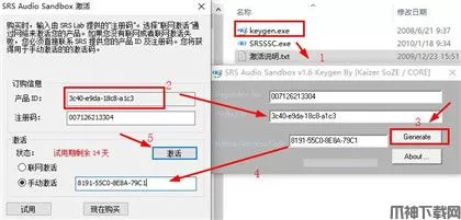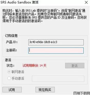 8、将注册码,以及手动激活代码复制到SRS Audio Sandbox的注册界面内,如下图所示,选择手动激活,再点击激活按钮即可