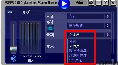 3、音箱可选耳机(在耳机中输出纯正的5.1音场),膝上扬声器(为笔记本电脑打造的选项),5.1环绕声(本款软件的主打,相信你会喜欢)等!