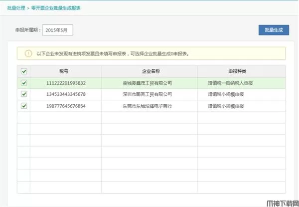 2、选中需要零申报的企业,点击“批量生成”按钮对零申报的企业进行报表自动填报。