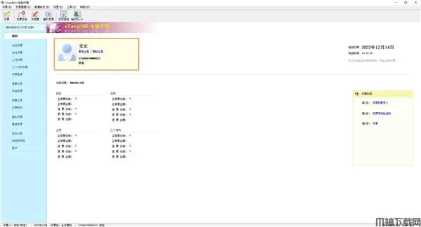 包括菜单栏、按钮工具栏、状态栏和快捷区。在按钮工具栏上主要是开票用按钮,在任何时候都可点击进行开票。单击快捷区的链接可在内容区显示相应内容。首页的内容包括登录人的信息、开票统计数据、开票向导和电脑时间。