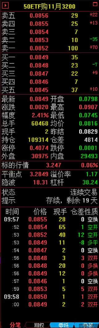 位于价格走势窗口右侧,含当前品种的买卖挂单价格、最新价、高开低收价格、成交量、成交明细信息。当前品种为股票期权时,还有股票期权的基本信息和特征值等信息。