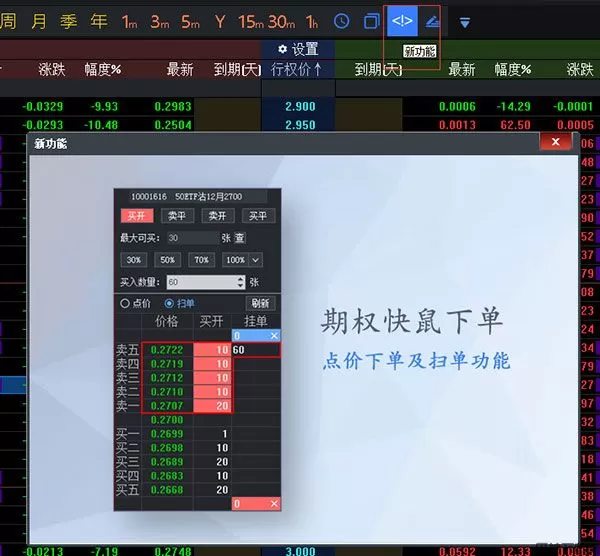 工具栏从左到右依次为:后退、刷新数据、放大、缩小、画线工具、指标管理、上翻、下翻、加入预警、期权T型报价、走势图、(日线、周线、月线、季线、年线、1m、3m、5m、Ym、15m、30m、1h)、周期切换、多屏支持、新功能、画线下单及右边的三个(批量下单按钮、交易弹出按钮、分析窗口弹出按钮)。