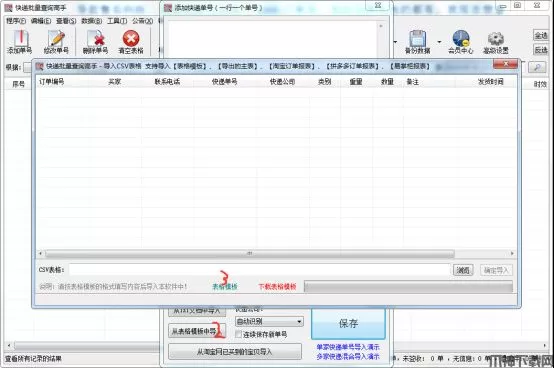 1、打开快递批量查询高手,点左上角的“添加单号”,再点“从表格模板中导入”--“表格模板”,如图: