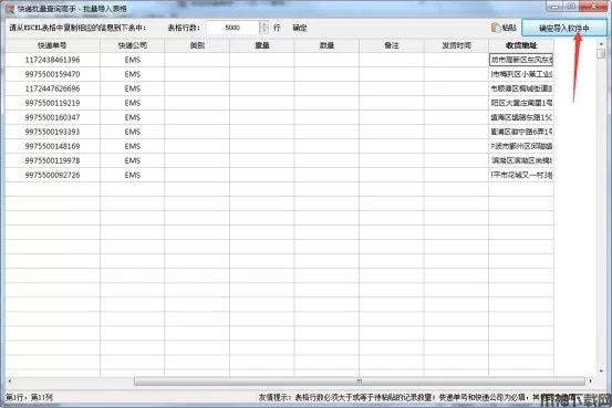 2、把快递单号、快递公司及收货地址复制到表格中,其他的列可以根据需要选填,然后点“确定导入软件中”,如图: