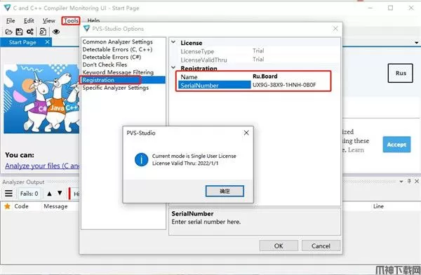 7、双击打开PVS-Studio软件,点击Tools--Options--Registration,将“key.txt”文件内的姓名和注册码复制到软件中