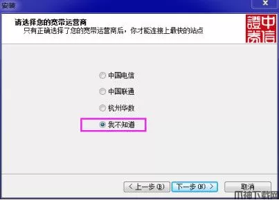 2、点击上图的“下一步”按钮,弹出如下安装界面,若您知道您的宽带运营商,可以自主选择,若不知道,默认勾选我不知道按钮,即可帮您自动判断: