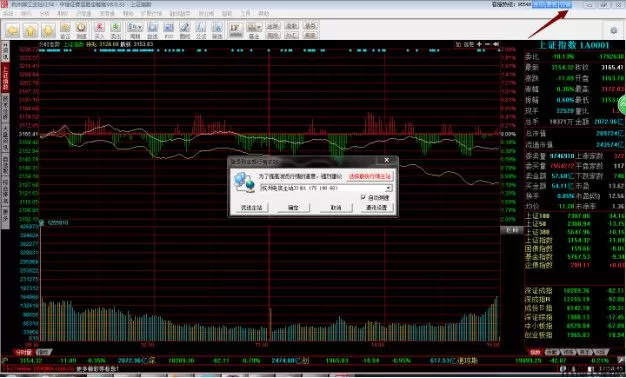 双击打开桌面快捷方式图标,输入账号密码登录后,进入行情界面如下图,点击右上角的行情按钮,弹出如图中间行情主站的登录框。