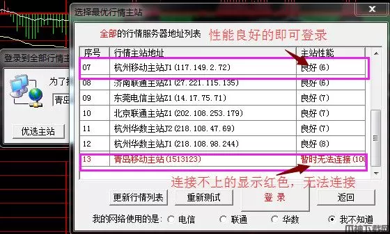 点击“优选主站”后,弹出“选择最优行情主站”界面,程序会自动检测行情主站服务器,测试完毕后会出现如下图界面,选择主站性能为良好的主站进行登录即可。