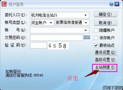 另外选择点击右上角“委托”,可进入“交易登录界面”再点击“主站测速”,可以对交易中心服务器进行测试。测试后界面如下图所示。
