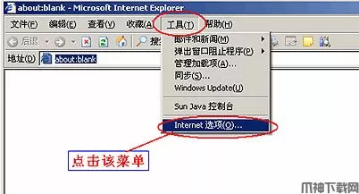 打开IE浏览器,点击“工具”菜单里的“Internet选项”。如下图: