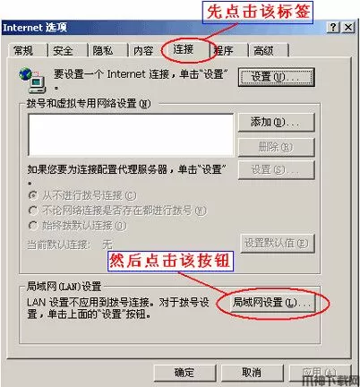 选择“Internet选项”菜单后弹出如下界面,选择“连接”标签,并点击“局域网设置”按钮。如下图: