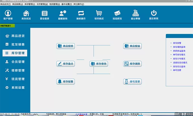 商品报损、商品报溢、库存盘点、库存查询、库存调拨、库存报警以及串号变更