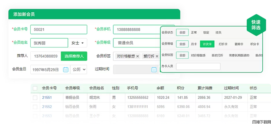 全方面帮您管理会员,助您会员越来越多!拥有不同类型和功能的卡片,可设置计次卡、打折卡、储值卡、积分卡、月卡季卡;支持会员推荐、员工开卡提成、根据自定义属性记录不同的会员资料;可进行会员充次、充值等。