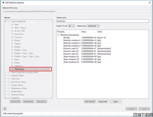 现在支持正交各向异性材料。这些材料的材料属性沿着相互正交的轴不同。您可以通过选择直生的材料类型。