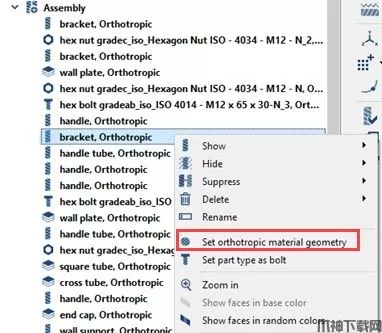 可以在上下文菜单中为中的选定零件定义正交各向异性材料装配工作台。