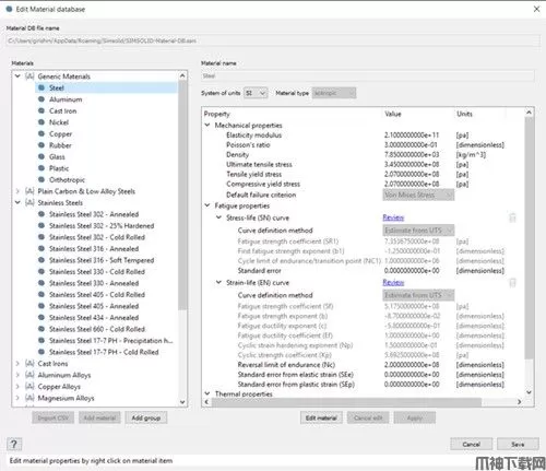 材料数据库现在支持正交各向异性材料特性和疲劳材料曲线。在疲劳特性下,应力-寿命和应变-寿命曲线都是受支持的。您可以从UTS估算疲劳特性,用斜率法输入它们,或者从。战斗支援车(combat support vehicle的缩写)文件。