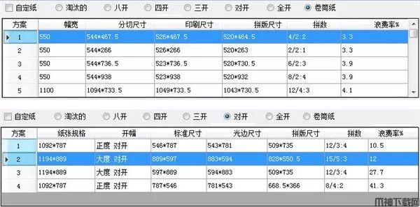 拼版显示区下端是分类开幅选项,点击其中一个开幅,即显示对应该开幅的拼版结果,如该开幅不可选,则说明该开幅没有合适的拼版方案。(如你需要查找到底那么开幅不合适,可以点击 淘汰的 这个方案中保留了所有没有列出的淘汰方案。