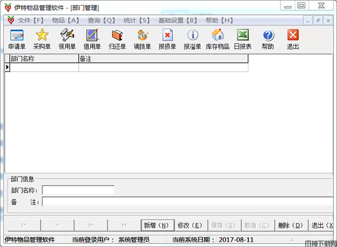2、部门设置——设置单位的部门信息,将来可以按部门查询领用,借用物品信息。
