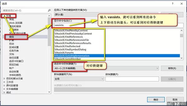 2、在 "显示命令包含:" 中输入 "vassistx." 就可以看到所有可以设置的快捷键了 ;