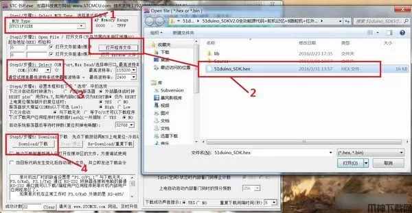 6、如代码无误,编译完成后在51duino_SDK文件夹中找到51duino_SDK.hex,这就是生成的固件,把USB-TTL串口线连接电脑和51duino主控板串口,用STC-ISP软件把固件烧录到51duino主控板,就可以看到效果了。