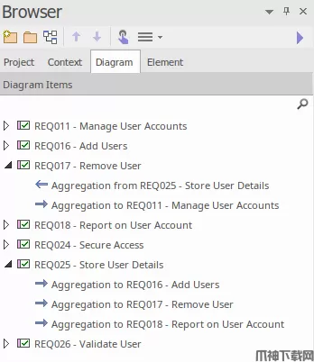 图浏览器是enterprise architect 15的一个很好的补充,它支持建模人员,他们专注于他们的可视化表示,并且对浏览器树中过滤的元素集合进行评估,这些元素只是位于当前图表中的元素。 现在,使用图表浏览器的过滤功能可以简化大图中的元素查找 - 结合在树中选择时突出显示和居中元素的功能。
