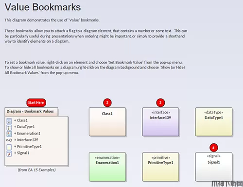 enterprise architect 15现在允许您在图表中的元素上设置书签值 - 这允许用户标记元素 - 特别适用于演示和演练,其中排序很重要。 元素上下文菜单具有设置值的选项,而图上下文菜单可以选择显示或隐藏所有值。