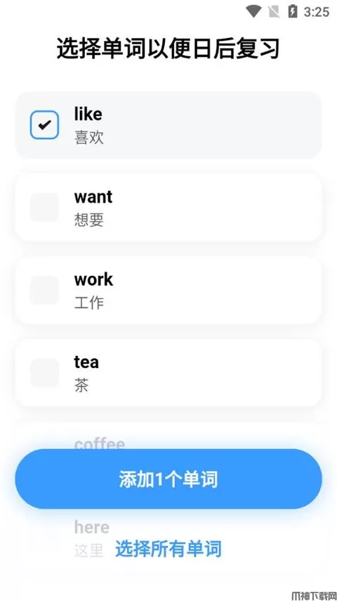2、选择单词开始学习,通过英译中,完成单词任务。