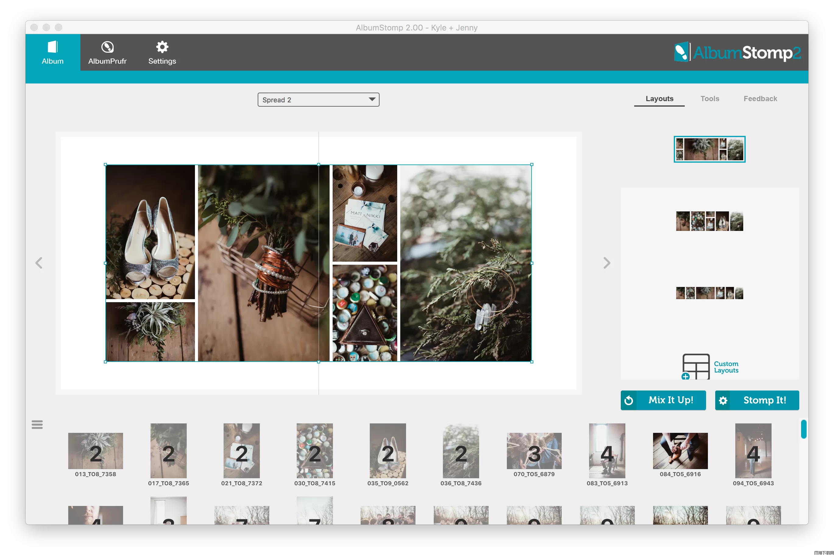 使用我们的独一无二的系统将图像放入预览窗格中,而AlbumStomp将会和你一起完成你的专辑。
