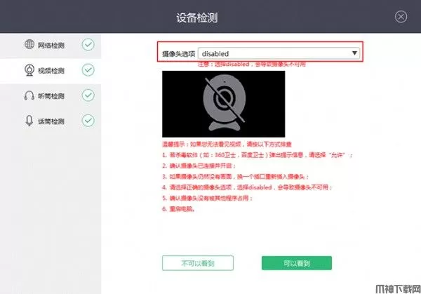 3、若下拉菜单中只有disabled选项,则说明摄像头插头未插牢,或电脑中摄像头驱动未安装(需更新),或摄像头损坏。