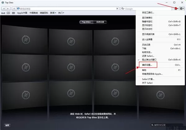 1、打开Safari浏览器后,点击右上角的齿轮图标,之后点击下拉菜单中的“偏好设置”选项。
